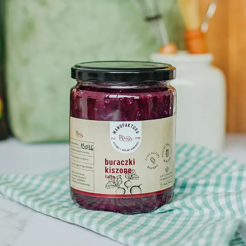 Buraczki kiszone naturalnie w beczce z użyciem czosnku, chrzanu i kopru oraz bogatej w minerały soli kamiennej z Kopalni w Kłodawie. Produkt niepasteryzowany.