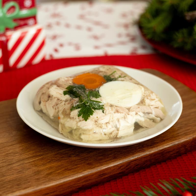 Elementy gotowanego kurczaka zatopione w galarecie z gotowaną marchewką oraz groszkiem. Idealna przystawka lub danie samodzielne – uzupełnienie menu śniadaniowego lub jako przekąska na kolację. Delikatniejsza wersja tradycyjnych nóżek wieprzowych, często wybierana przez Panie. Smakołyk wielu dzieci.