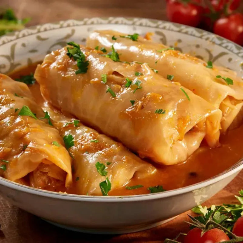 Tradycyjnie zawijamy farsz z najlepszych kawałów wieprzowego mięsa w połączeniu z ryżem w soczyste liście białej kapusty. Duszone w aromatycznym pomidorowym sosie na prawdziwym warzywnym wywarze. W opakowaniu znajduje się 2-3 sztuki gołąbków.