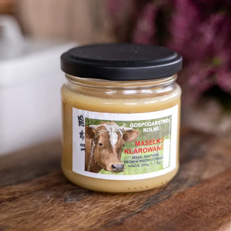 Masło krowie klarowane wytwarzane rzemieślniczo w naszym gospodarstwie.